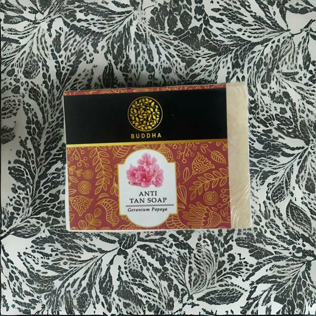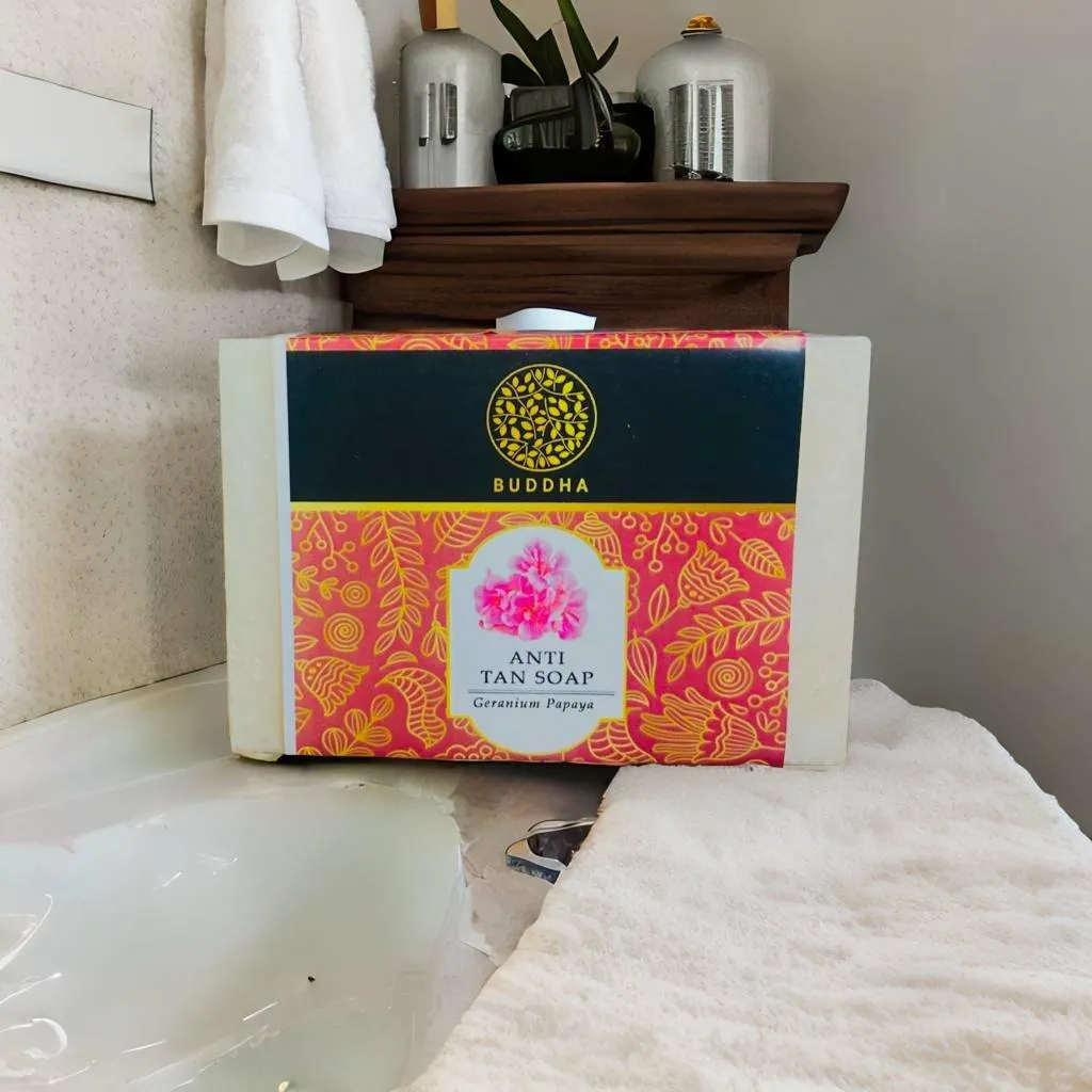 INGREDIENTS- Buddha Natural Anti Tan Soap is derived from Coconut oil, Licorice Oil, Sesame Oil, Papaya Extract, Geranium Oil, and Rosemary Oil.